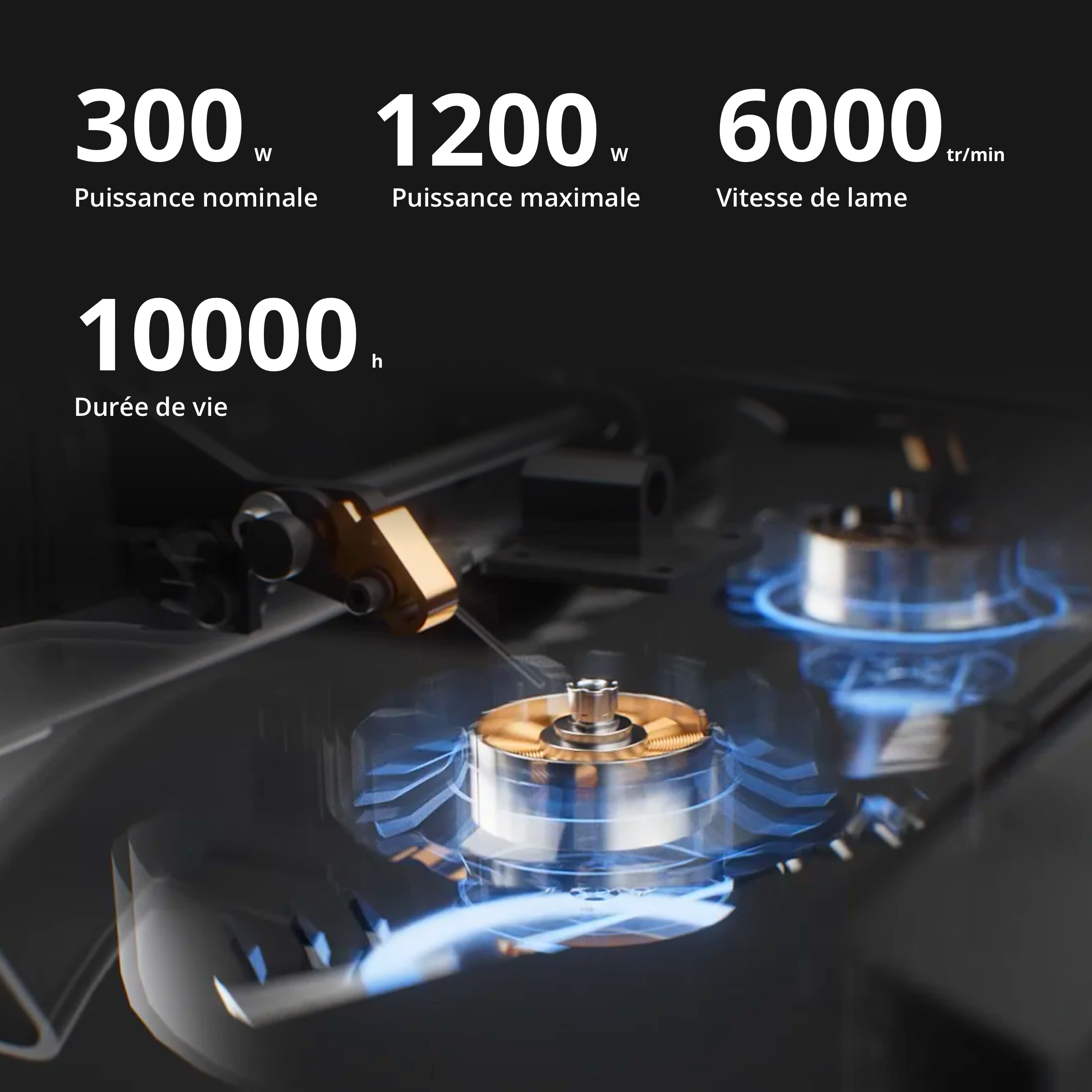Le moteur sans balais intelligent offre un fonctionnement sans frottement pour réduire l'usure, tout en ajustant dynamiquement la puissance de sortie en temps réel pour éviter les surcharges et garantir des performances constantes.